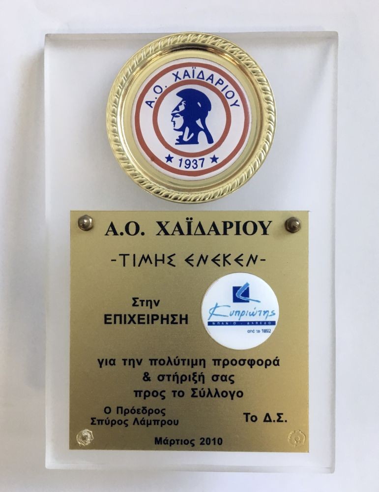 Τον Μάρτιο του 2010 απονεμήθηκε στην εταιρία μας τιμητική πλακέτα για τη συνεισφορά της στην ομάδα ποδοσφαίρου του Α.Ο. Χαϊδαρίου. Η εταιρία μας υπήρξε χορηγός της τοπικής ομάδας επί τρία συναπτά έτη, η οποία με την σειρά της τοποθέτησε το λογότυπο της εταιρίας στις εμφανίσεις της ομάδας.