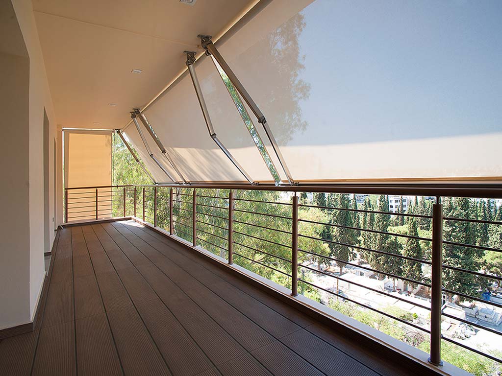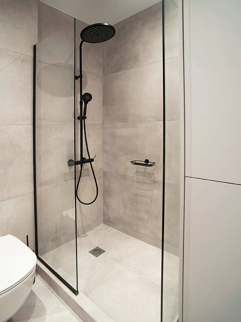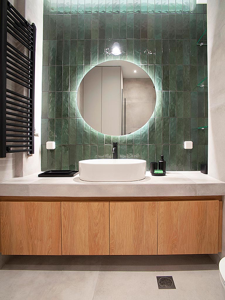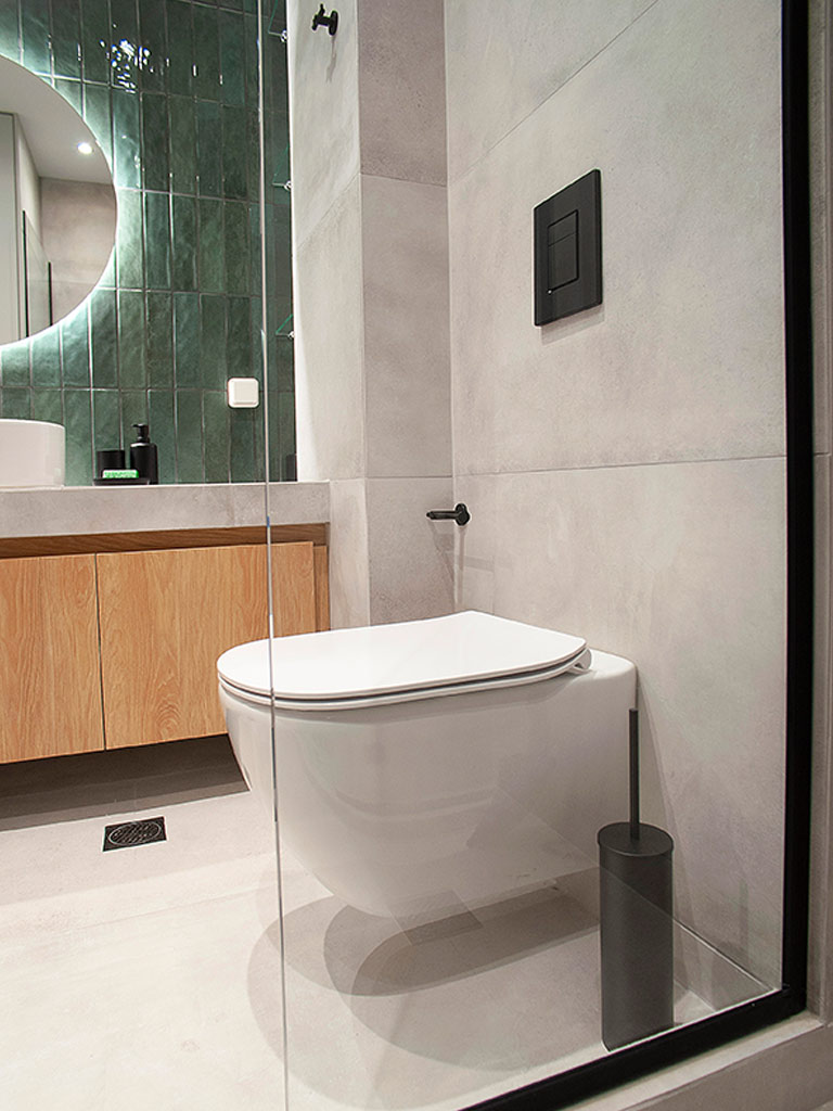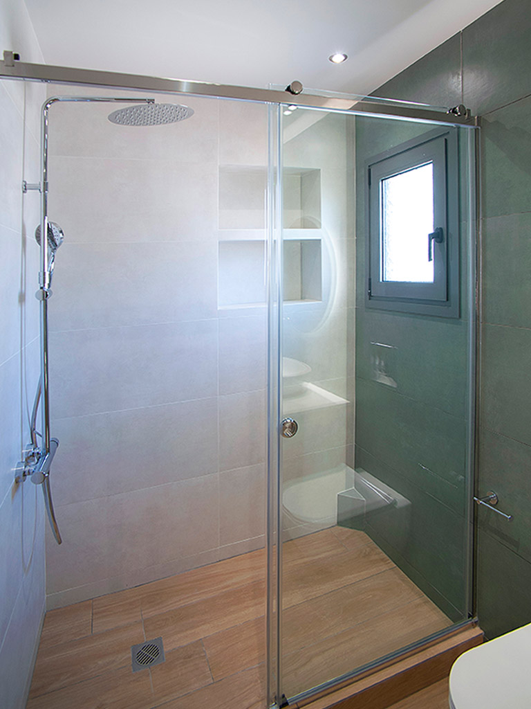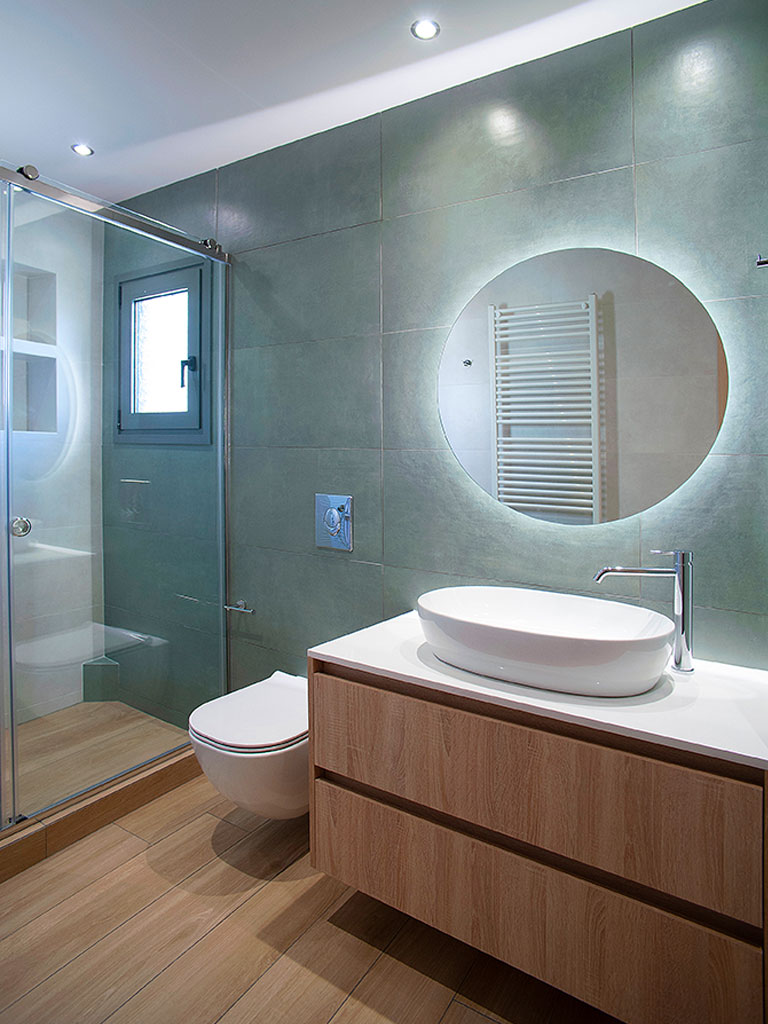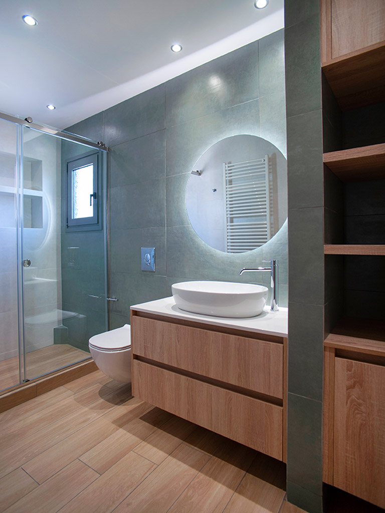 Κάποια από τα μπάνια επενδύθηκαν με πλακάκια σε αποτέλεσμα ξύλου ενώ τα υπόλοιπα με λευκά πλακάκια. Τα λευκά πλακάκια έχουν μοντέρνα υφή σε αποτέλεσμα τσιμέντου, αποπνέουν καθαριότητα και έρχονται σε αρμονία με το λευκό μάρμαρο Διονύσου της Ακρόπολης. Η επιλογή του ξύλου έγινε με στόχο την ομοιομορφία με τα δάπεδα των δωματίων. Πλακάκια σε αποτέλεσμα μαρμάρου και ξύλου επιλέχθηκαν για τα δάπεδα των μπάνιων, hall και εστιατορίου. Στις σουίτες τοποθετήθηκαν mini πισίνες η οποίες έχουν θέα την Ακρόπολη.