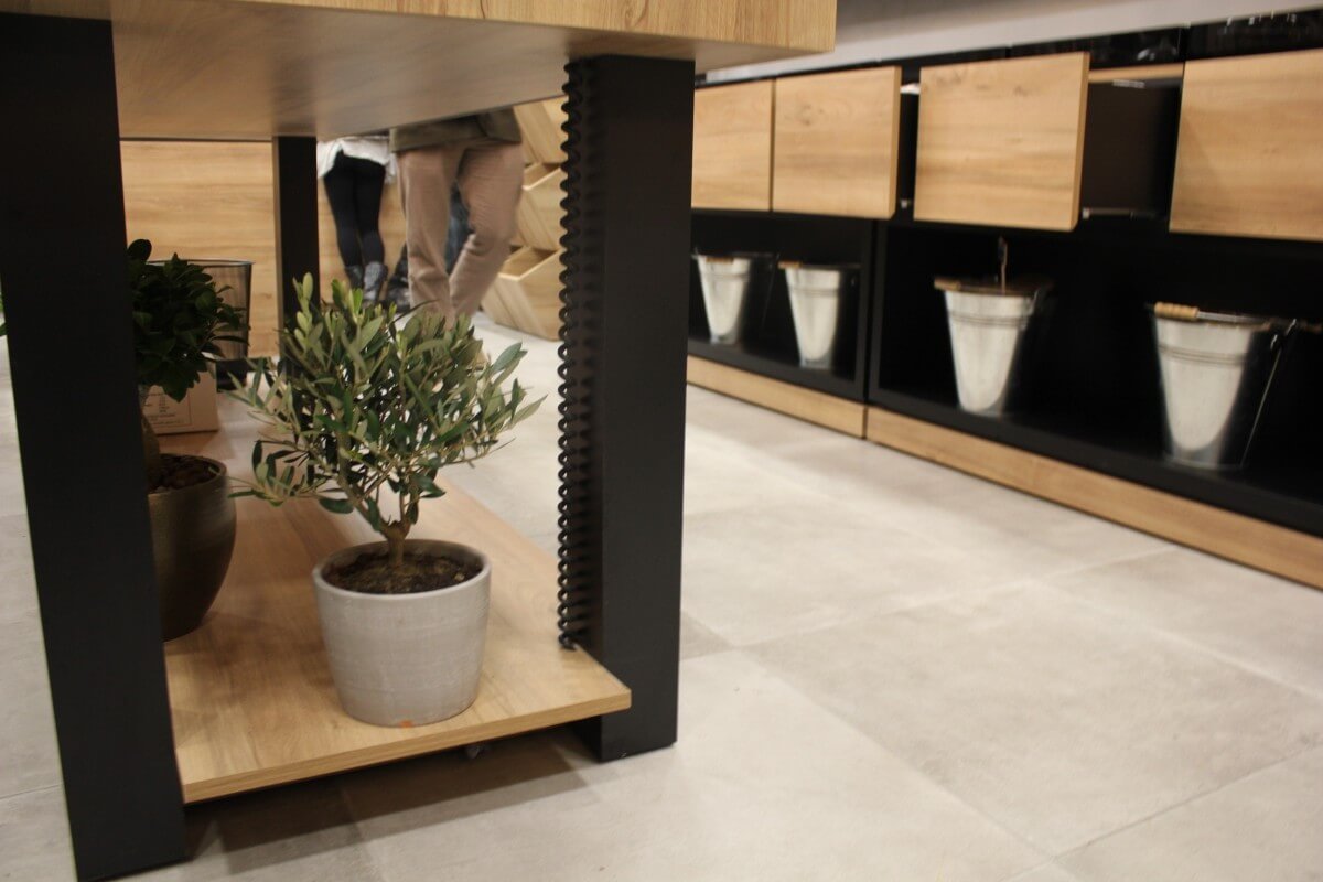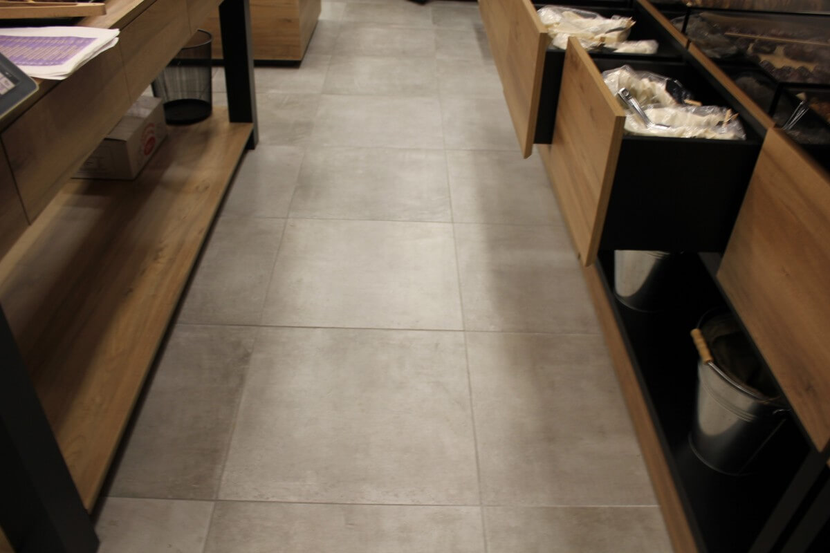 Τα πλακάκια που χρησιμοποιήθηκαν είχαν διάσταση 60×60 σε αποτέλεσμα τσιμέντου. Η επιλογή έγινε με κριτήριο την ανάδειξη των ξύλινων στοιχείων που τοποθετήθηκαν στο κατάστημα.
