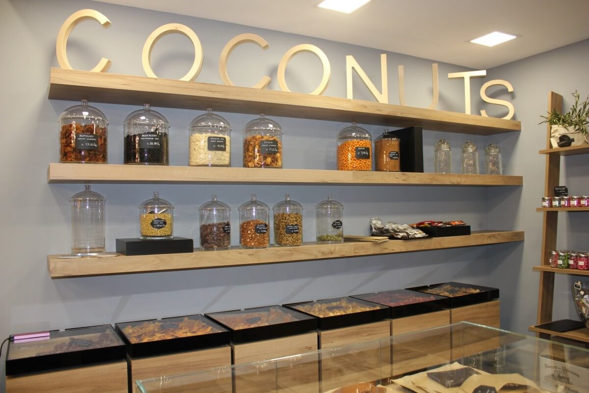 Χαρακτηρισμένο από την διαδικτυακή εφημερίδα “GlyfadaNews” ως ένας μικρός παράδεισος καλής ζωής και αισθητικής το Coconuts αποτελεί αδιαμφισβήτητα μια όαση ποιότητας στην καρδιά της Βούλας. Μια έμπνευση του κ. Δημήτρη Κουφογιάννη που κληθήκαμε μαζί να υλοποιήσουμε, εξοπλίζοντας το χώρο με πλακάκια και είδη υγιεινής. Η προσωπική δουλειά του ιδιοκτήτη είναι φανερή καθώς τα αγαθά ανανεώνονται σε τακτική βάση. Η γκάμα είναι τεράστια προσφέροντας από αποξηραμένα ξηρά φρούτα μέχρι και γλυκά του κουταλιού.