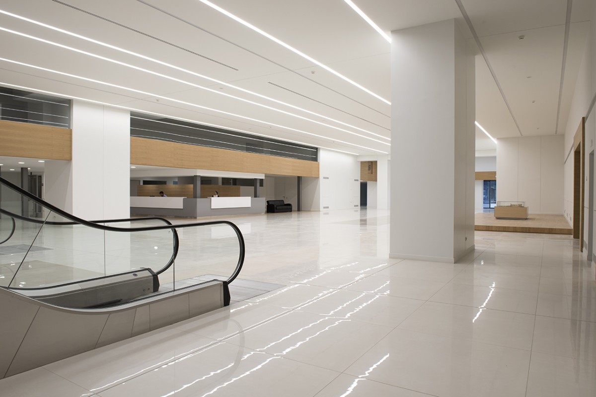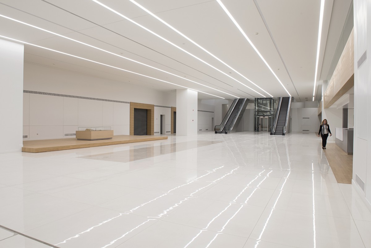 Για το έργο ζητήθηκαν 3.000m² πλακάκια 120×120 γυαλιστερά βαριάς καταπόνησης. Αυτό κρίθηκε αναγκαίο καθώς από το δάπεδο περνάνε από καρότσια μέχρι και παλετοφόρα. Τα πλακάκια είχαν εξαιρετικές μηχανικές αντοχές PEI 5 και σε κλίμακα MOHS δείκτη 6. Ήταν πραγματικά μια πρόκληση να βρεθεί τόσο μεγάλο πλακάκι με ανάλογες προδιαγραφές. Στα μπάνια χρησιμοποιήθηκαν πλακάκια διάστασης 100×300 slim 3,5mm με εντοιχισμένα είδη υγιεινής.