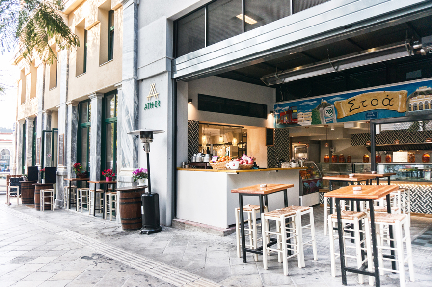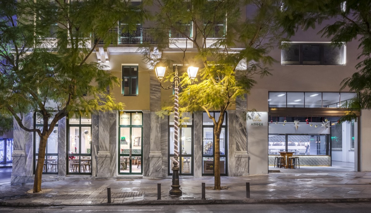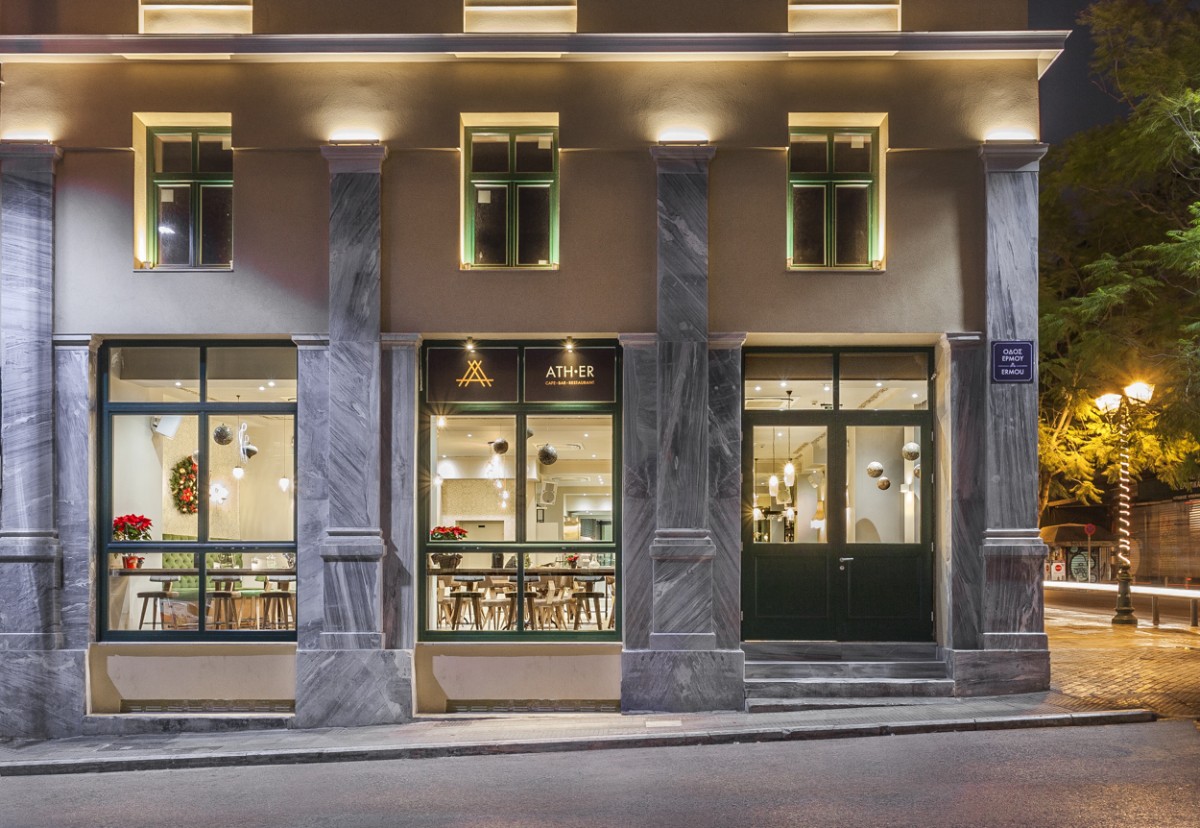 Το Αther Cafe Bar Restaurant βρίσκεται στην γωνία όπου συναντιούνται δύο από τους πιο εμπορικούς αθηναϊκούς δρόμους. Ο ιδιοκτήτης του, κ. Γεραμάνης, εμπνεύστηκε το παιχνιδιάρικο όνομα του all-day bar από τους δύο δρόμους, ΑΘηνάς & ΕΡμού. Το Ather στεγάζεται σε ένα ανακαινισμένο νεοκλασικό κτίριο. Το ισόγειο είναι καλαίσθητα διακοσμημένο για να προσφέρει άνεση στον επισκέπτη, ενώ οι μεγάλες τζαμαρίες δίνουν απευθείας αίσθηση της ζωντάνιας που επικρατεί στην πάντα πολυσύχναστη πλατεία Μοναστηρακίου.