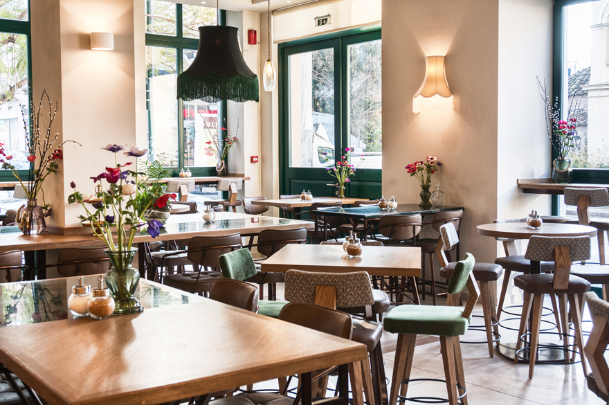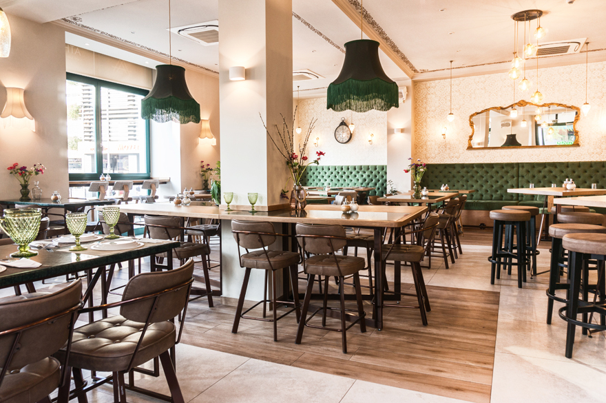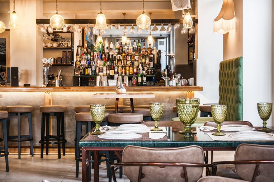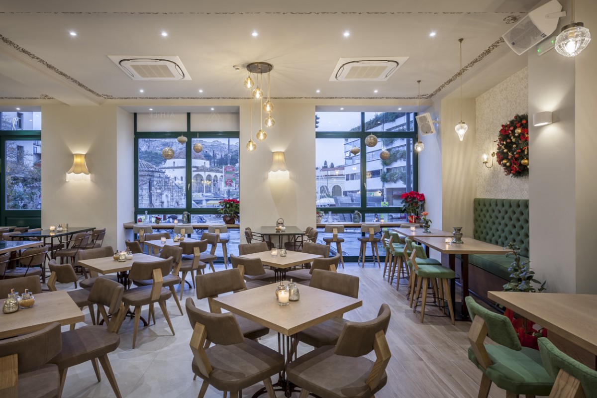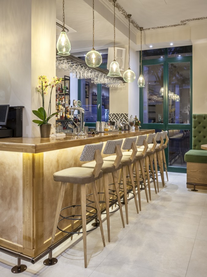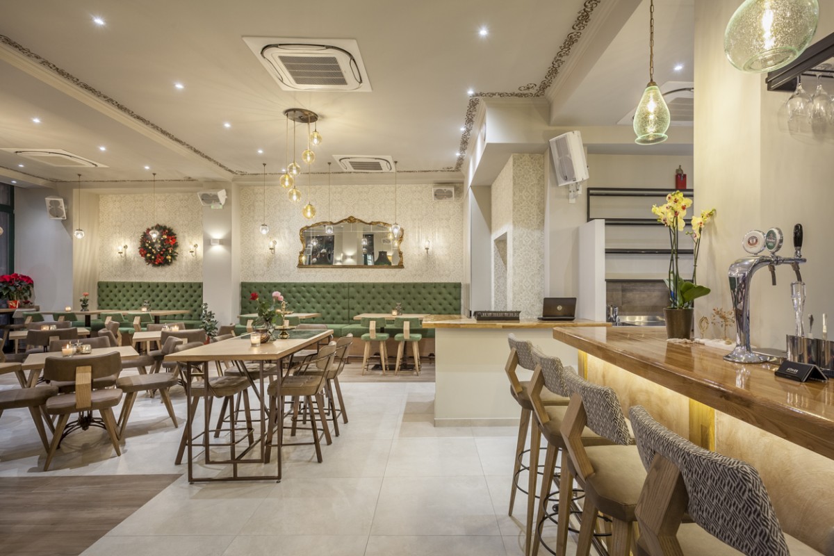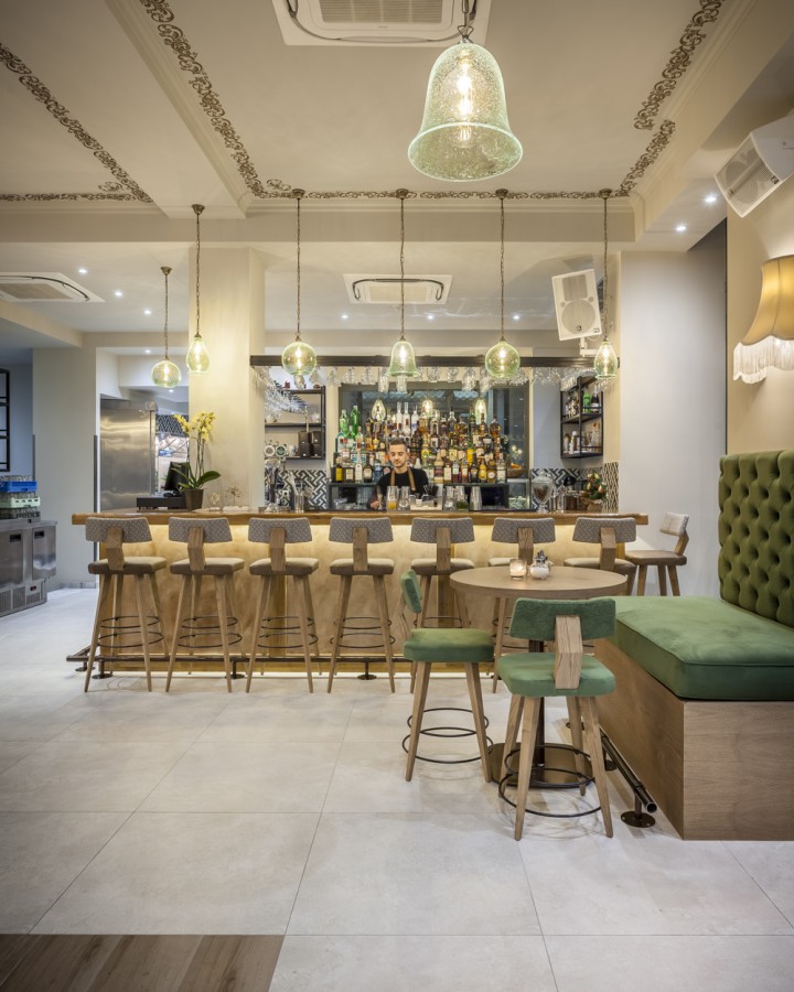 Ένα ακόμα έργο που ολοκληρώθηκε χάρη στο μεράκι του ιδιοκτήτη του. Τα υλικά που προτιμήθηκαν ήταν πλακάκια διάστασης 75×75 σε μπεζ αποχρώσεις τα οποία συνδυάστηκαν με πλακάκια τύπου ξύλο σε διάσταση 23×120. Διάθεση του ιδιοκτήτη ήταν να δώσει γήινη και οικεία χροιά στον χώρο. Στο εξωτερικό μπαρ, που εξυπηρετεί το μετρό, χρησιμοποιήθηκε ένα πλακάκι διάστασης 30×30 το οποίο προσομοιάζει μαίανδρο ώστε να δεθεί εξωτερικά με την όψη του νεοκλασικού κτιρίου.