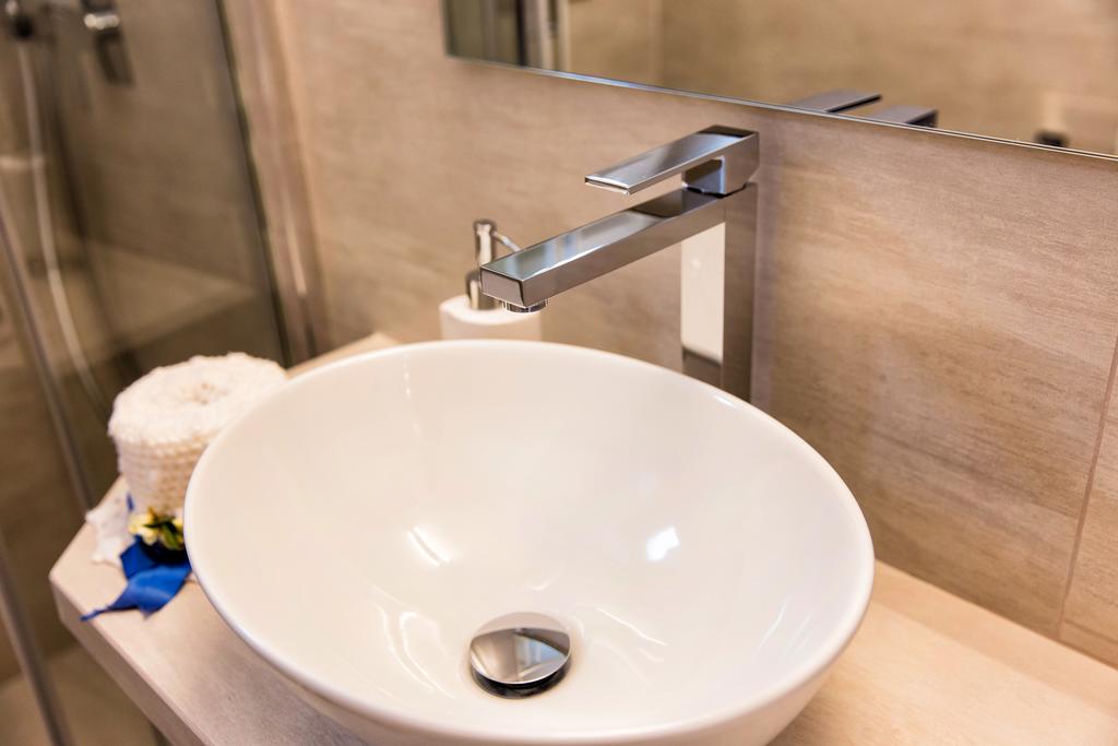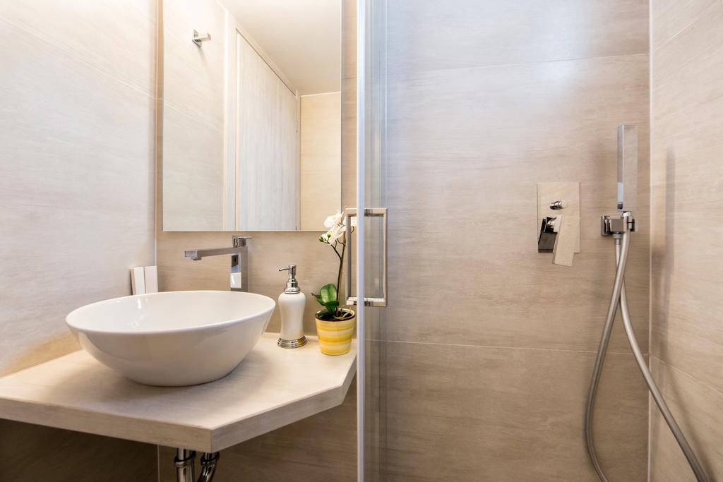 Κατά την ανακαίνιση, χρησιμοποιήθηκαν πλακάκια μεγάλης διάστασης τα οποία προσομοίαζαν τσιμεντοκονία και τοποθετήθηκαν τόσο στο δάπεδο όσο και στα μπάνια. Minimal είδη υγιεινής και μπαταρίες χρησιμοποιήθηκαν στα μπάνια σε τετράγωνες γραμμές.