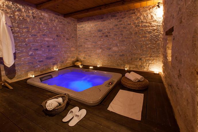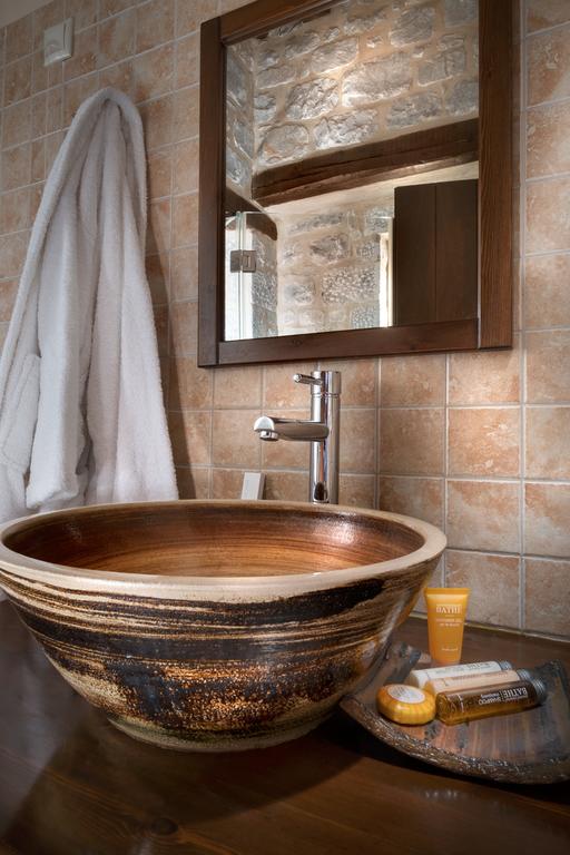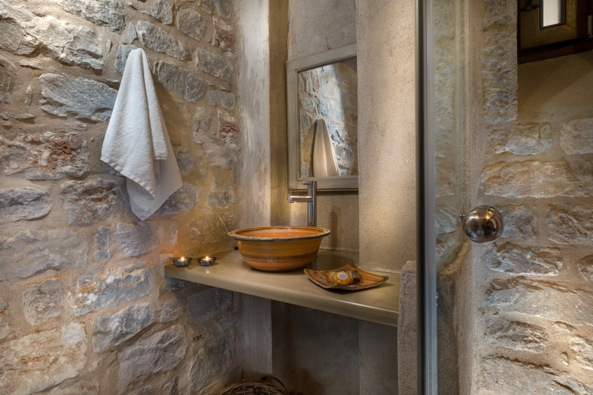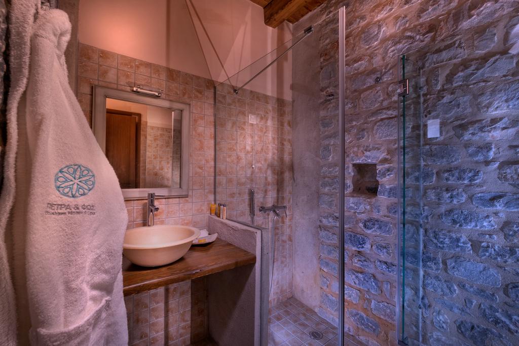 Στο “Πέτρα & Φώς” χρησιμοποιήθηκαν κυρίως φυσικά υλικά. Τα λιγοστά πλακάκια επιλέχθηκαν με κριτήριο το ρουστίκ ύφος σε γήινες αποχρώσεις έτσι ώστε να εναρμονίζονται με την πέτρα. Χρησιμοποιήθηκαν κλασσικού ύφους είδη υγιεινής σε συνδυασμό με μπαταρίες σε λιτές γραμμές.